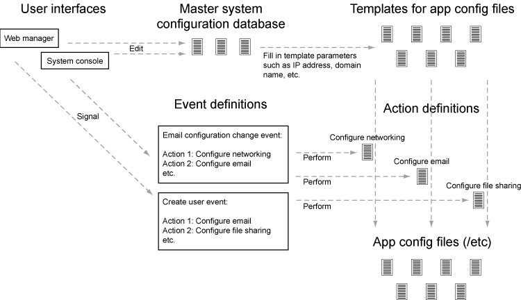 The user interface changes values in the configuration database. This database (actually a collection of databases) contains parameters describing the state of the system (IP address assignments, policy settings, domain names, email server configuration, user accounts, and so on). The user interface does not perform the application reconfiguration, but instead signals an event to perform the changes.
